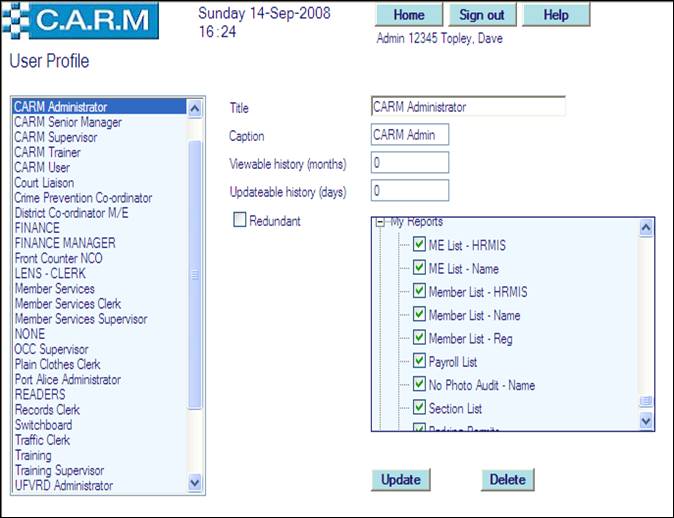 Under that folder, a System Administrator should create as many folders as necessary to hold the client-written crystal report files. Each folder may be access controlled using the standard User Profiles once they have been configured into CARM. So, for example, there may be a set of reports for the Finance department that may all be set in a 'Finance' folder and only finance personnel may then be allowed access to that set of reports.