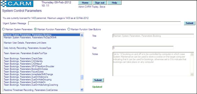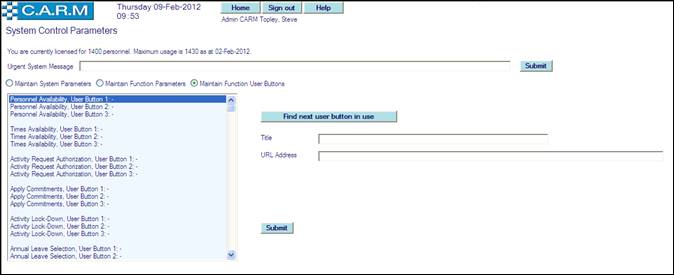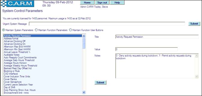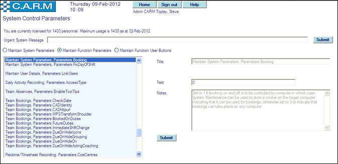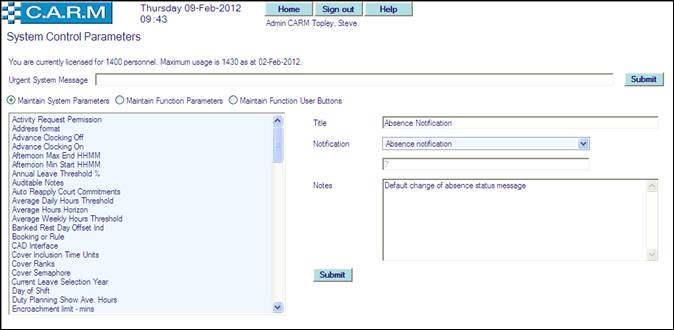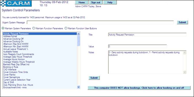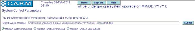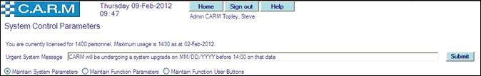 Enables a CARM Administrator to enter a system wide moving message for the attention of all logged on CARM Users.