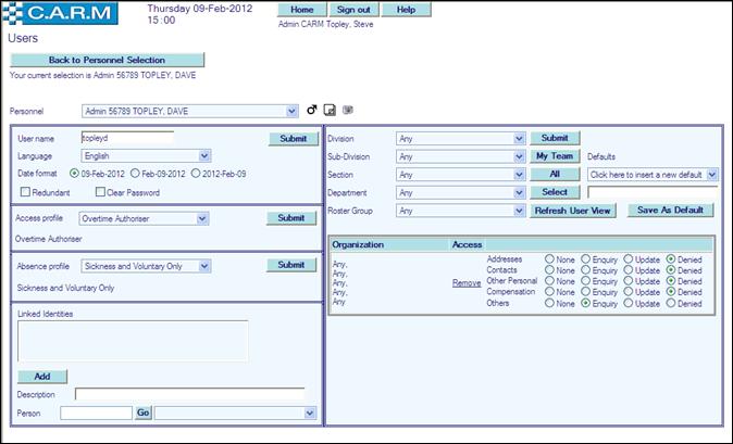 The creation of one user for a person who may have more than one post in the organization: e.g. a part-time Reception Officer who is also a Special Constable. Each post may have different working conditions and therefore compensation, so there is a need for them to be able to log on as the same person, but record their time against the appropriate post. In addition, CARM needs to monitor their working time for both posts.