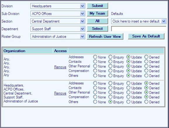 · Update - indicates update capability (which includes viewing) to that information - and overrides None and Enquiry for any other overlapping organization selections e.g. If you set 'Enquiry' for 'Any' part of the organization, you can override that with 'Update' for specific parts of the organization.