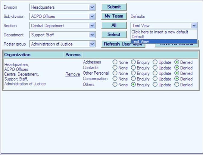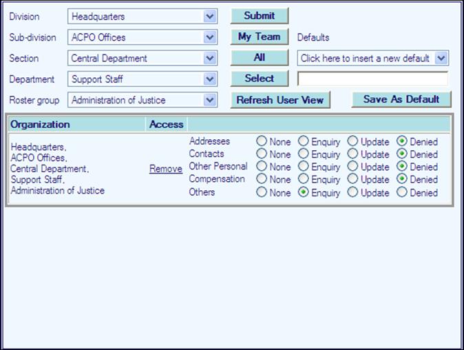 · Select Organization structure (Division-Roster Group) for the user to access, from the drop downs or use shortcut buttons My Team (for the users own team) or All for everything.
