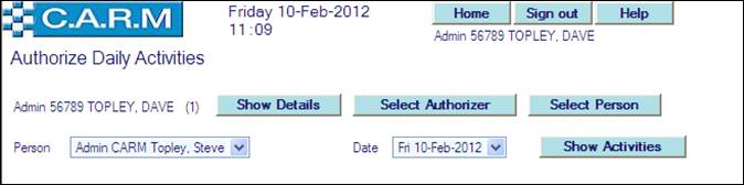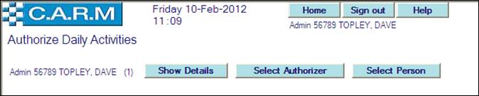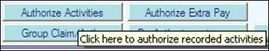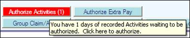 On Home Page the Authorize Activities(n) button will be red (with optionally a flashing amber light). This indicates to Authorizers that there are Daily Activity records that require their attention for Authorization or Rejection. Move the cursor over the button to show detail.