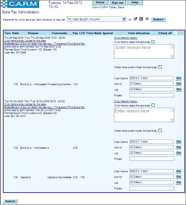 Cost Centre, Job and Activity Codes are identified during setup and maintained by a system administrator. Use any appropriate combination (or the defaults) of these when administering Extra pay. If the code required is not available, please see a CARM Administrator. Where Extra pay has been split between different reasons/sub-reasons, there will be separate entries to administer. |