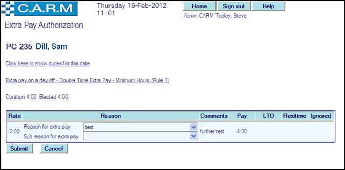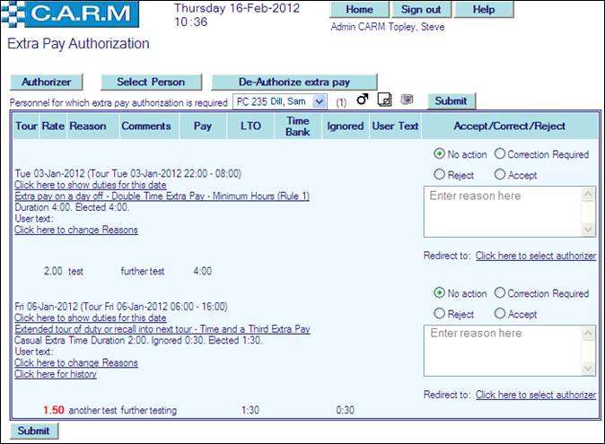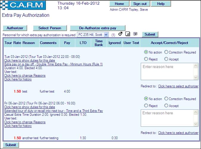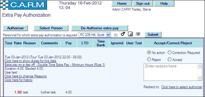 There may be a number of personnel to authorize Extra pay for: Allows authorization of Extra pay for all personnel viewed. There may be additional information displayed in the Extra pay details depending on system control parameter settings, for example, cost centres, cost activities, cost jobs and project codes.