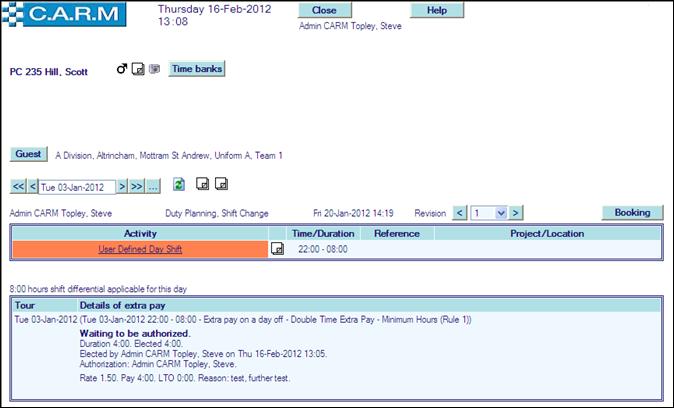 Shows the shift times and any activity or Project/Location details booked on the day: if you are a supervisor, it may help you to decide if the Extra pay should be authorized or rejected.