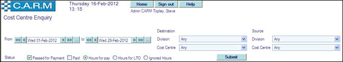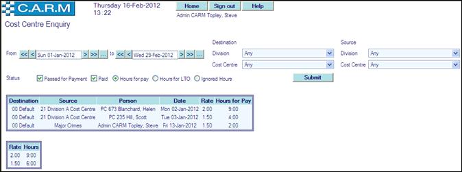Destination and Source cost centres are normally based on existing financial/budgeting criteria set by the Finance Department. You will often select the same destination and source cost centres for the enquiry i.e. the area that incurred the Extra pay will pay for it. However, the Destination may reflect who is being charged for say a football match and the Source reflect that of the areas who provided the people. |
