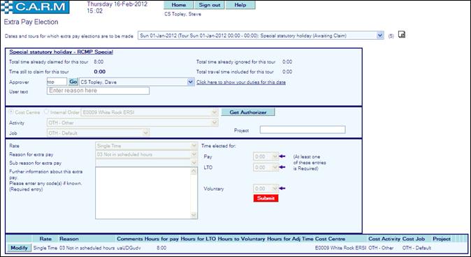 Split the time between pay, time off in lieu, flexitime and voluntary (ignored) as required. There is no need to allocate all the Extra pay at the same time. However, as soon as you make a valid election, the supervising officer will receive notification that they have Extra payto authorize. |