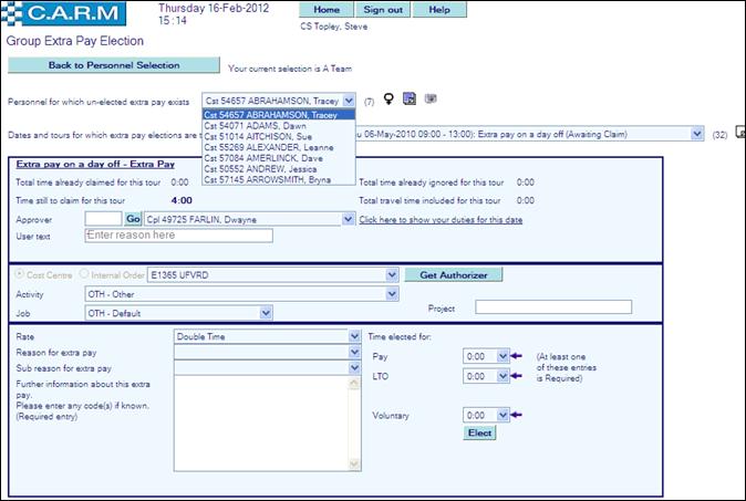 · Select personnel to elect Extra pay on behalf of.
