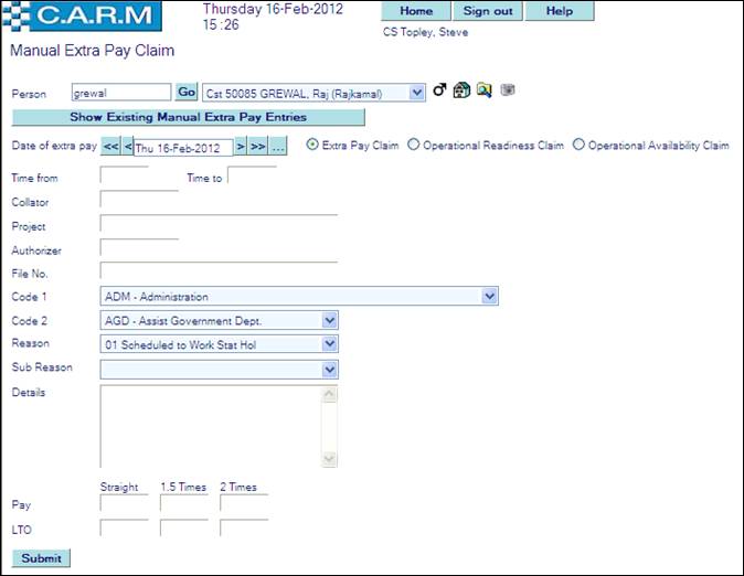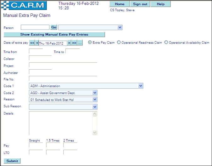 Occasionally Extra pay may have to be recorded, that lies outside the scope of CARM working conditions. For example, carrying out duties for a part of the organization that currently is not covered by CARM, or additional Extra pay payments awarded for extra meritorious efforts. Enable manual Extra pay entries to be made so that they may be included in the Payroll extraction process.