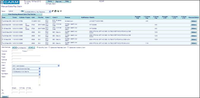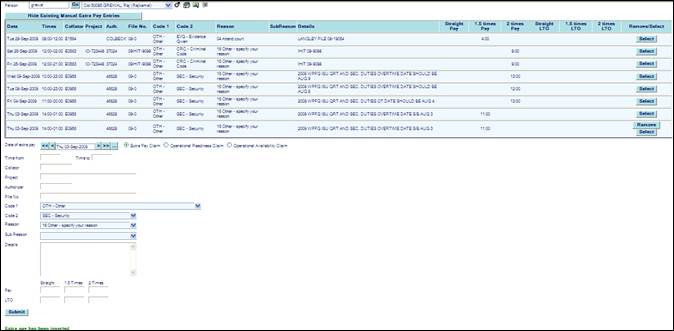 · Any previously entered manual Extra pay entries will be listed. Any that have not yet been paid will be given the option of being removed. (Remove button in the example above). Enable corrections to be made to any unpaid Extra pay previously entered. All entries will be given the option of selecting it to pre-fill the form with the same information. (Select buttons in the example above).