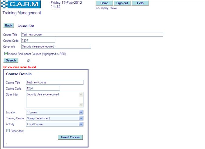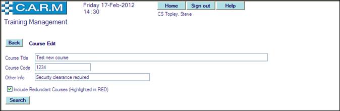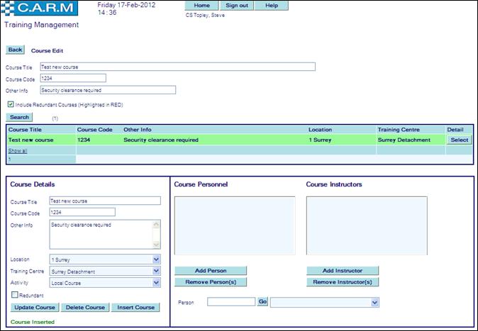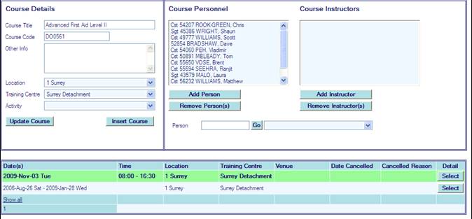 All the primary information about the course itself: e.g. course title, course code, training centre reference, wish lists (Course Personnel) and qualified instructors (Course Instructors).