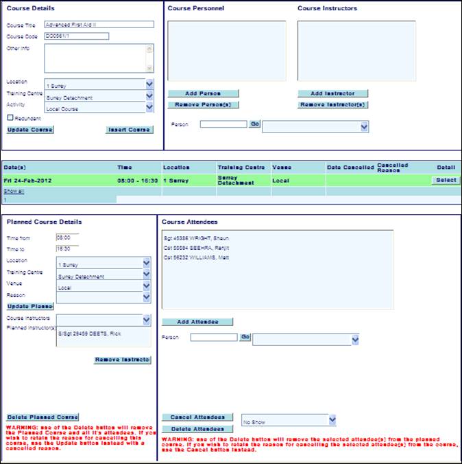 WARNING: use of the Delete Planned Course button will remove the Planned Course and all its attendees. If you wish to retain the reason for cancelling this course, use the Update Planned button instead with a cancelled reason. |