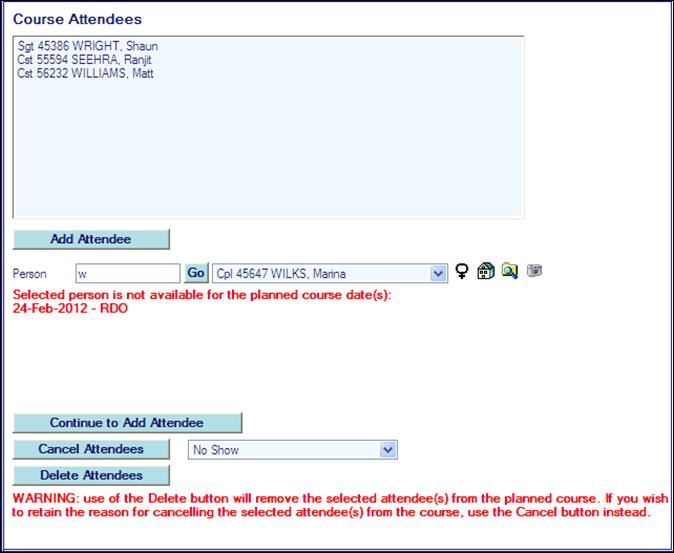 WARNING: use of the Delete button will remove the selected attendee(s) from the planned course. If you wish to retain the reason for cancelling the selected attendee(s) from the course, use the Cancel button instead. |
